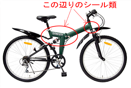 でも、重要な注意事項が書かれたシールは剥がさないほうがいいよ。下の写真では露光オーバーで白くなってるけど。折りたたみの方法とか、サスペンションの調整方法が書かれてある。